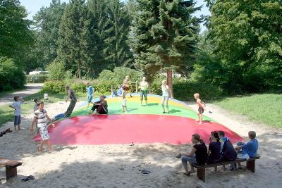 Mit Hüpfkissen und Kletterturm in der Nähe des Kinderstrandes |
