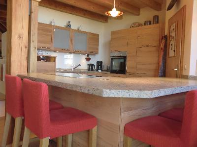Hochwertige Kernbuche-Holzküche der Marke Oster. Der Traum aller Hobbyköche, denn die Einrichtung bzw. Ausstattung verleitet Sie zu kulinarischen Höchstleistungen. Zum Essbereich hin ist die große Kochinsel (5-Platten-Ceranfeld) mit Barhockern. Steinboden. Kaffeefilter, Küchentücher, Spülmaschinen- u. Handspülmittel sowie sämtliche Mülltüten stellen wir gratis zur Verfügung. |