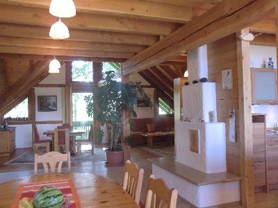 Ökologische Wärmedämmung Holzfaser-Einblasdämmung (Öko-Test: sehr gut), kein Standbye, sondern Kippschalter. Im Winter, wenn die Bäume beim Haus laubfrei sind, hilft die Sonne heizen. Im Sommer sind die belaubten Bäume idealer Sonnenschutz. Wandstrahlungsheizung und Warmwasser über Holzheizung. Diese wird mit Holzresten aus unserer Holzbau-/Zimmereiwerkstatt (wo baubiologische Holzhäuser handwerklich gefertigt werden) und mit Buchenholz aus dem angrenzenden Wald befeuert. |