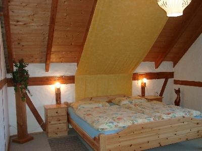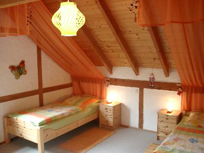 Im Kinderzimmer "Schmetterling" im OG mit großen Betthimmeln ist Platz für ein zusätzliches bequemes Luftbett. Der "Dachsbau im DG hat 1 Doppel- und 3 Einzelbetten aus Massivholzbalken, 1 Kleiderschrank und Kommode sowie Radio. Nebenan im Flur sind Einbauschränke. |