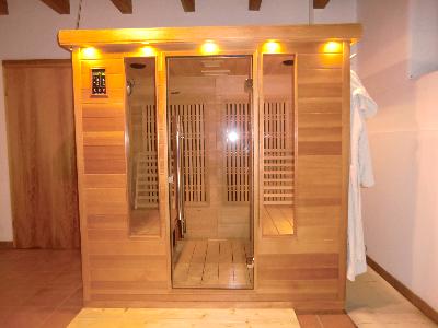 + 4-Personen-Infrarot-Sauna mit Heilsteinen im Fitnessraum.