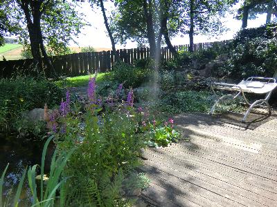 Wie oben beschrieben. 3 möblierte Balkone. Auf dem Süd-Ost-Balkon sind große Naturholz-Sitzgruppe, schwenkbares Sonnendach und Hängematte. Hofbereich mit Naturholz-Umzäunung und verschließbarem Hoftor. Holzterrassen u. ältere schattenspendende Bäume. Wasserfall mit Bachlauf und Bio-Fischteich. Gästeparkplätze, Gartenmöbel, Sonnenliegen, gr. Ampelschirm. Grilleinrichtungen mit Gratis-Grillholz. Hinter der Umzäunung Wiesen mit herrlich bunten Wildblumen.
