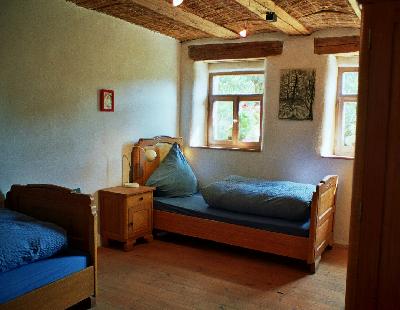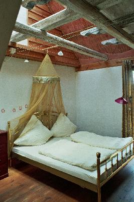 Die Betten haben alle Schaumstoffmatzratzen, oder sind Baumwollfutons (Auf dem Sternenguckerbett) Bettzeug sind Federbetten, Überzüge mit Ökowaschmittel gewaschen und luftgetrocket. Die Betten sind alle sehr phantasievoll und romantisch. Schränke aus Vollholz. |