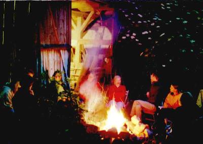 Feuerplatz mit Stockbrotstecken, Spielplatz ist gegenüber mit Sandkasten und Rutsche. |