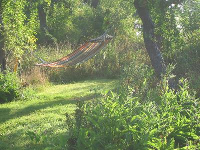großes Naturgrundstück mit verschiedenen Sitzplätzen, Hängematte, Grillecke